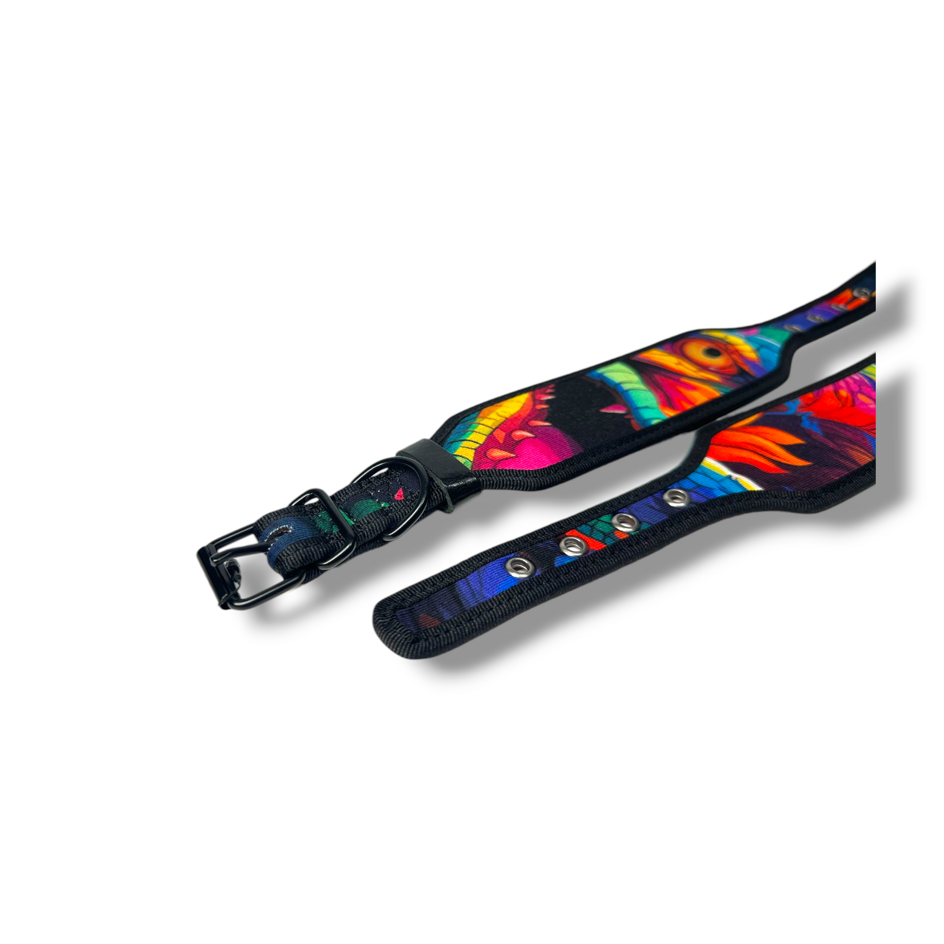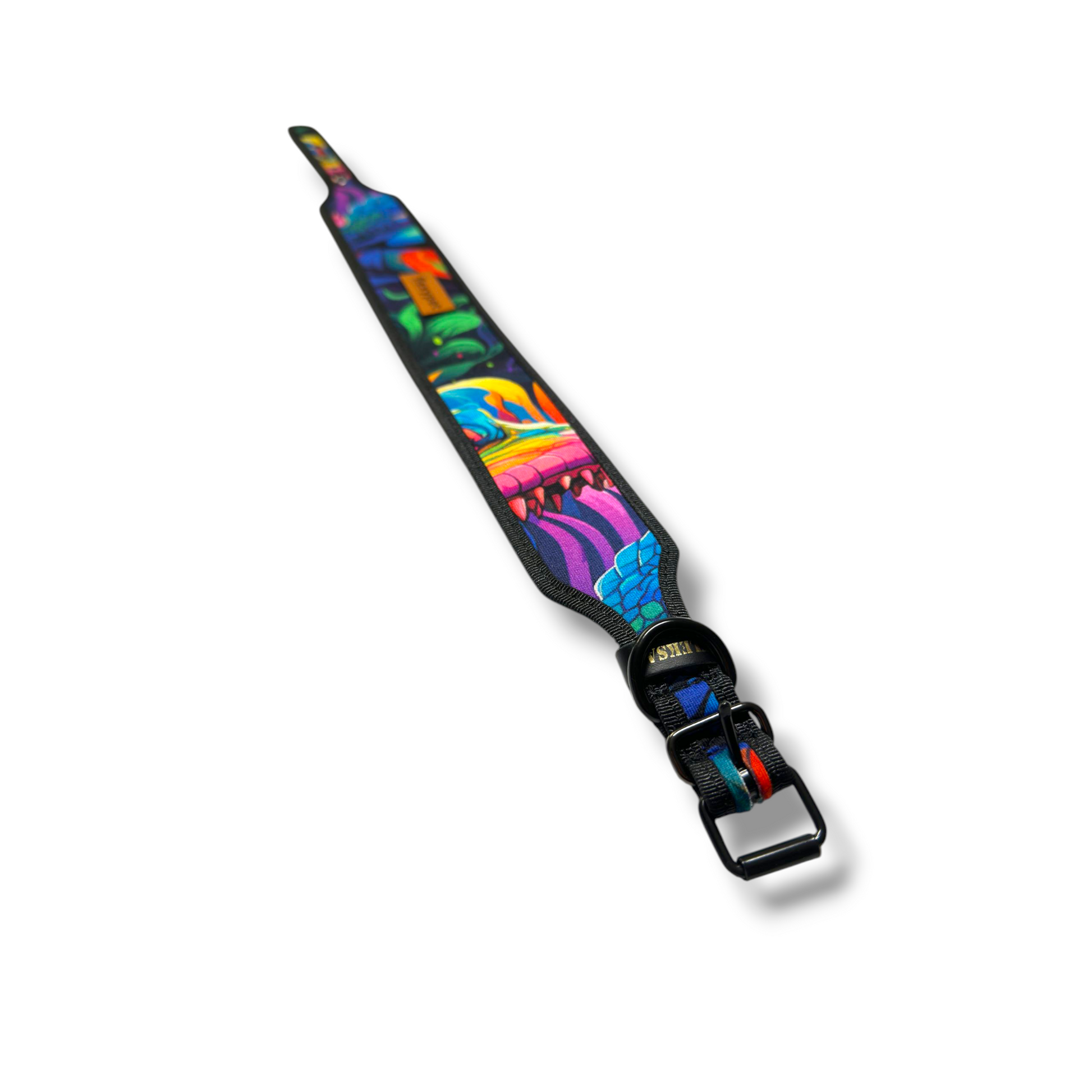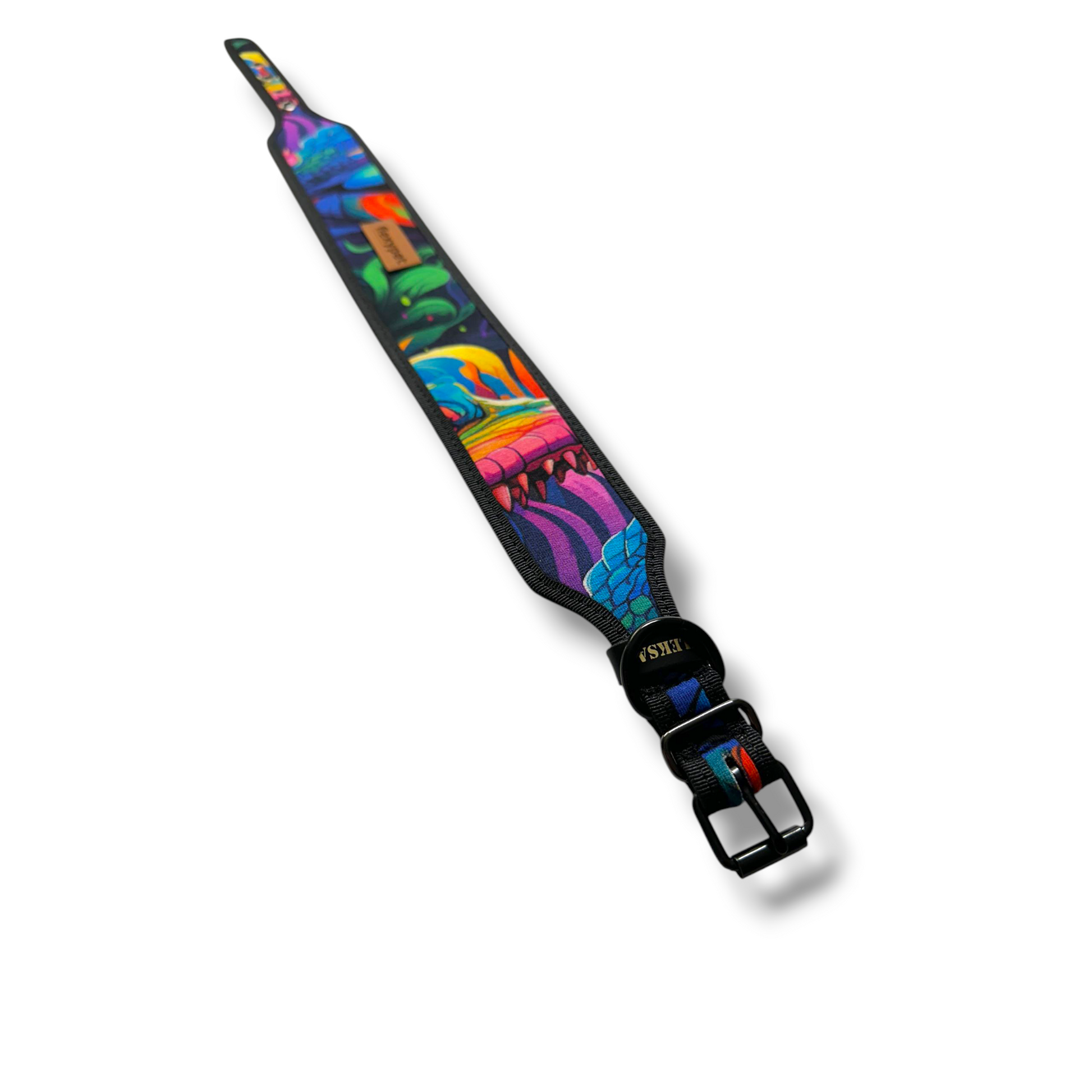 Fabric collar for larger dogs: Vibrant outer layer stitched with reflective threads, soft breathable inner lining, and durable metal buckle. Tailored for larger breeds, offering a snug fit without restricting movement. Designed for daily wear. Crafted with polyester, neoprene, metal, and elastane. Available in multiple sizes for easy selection.