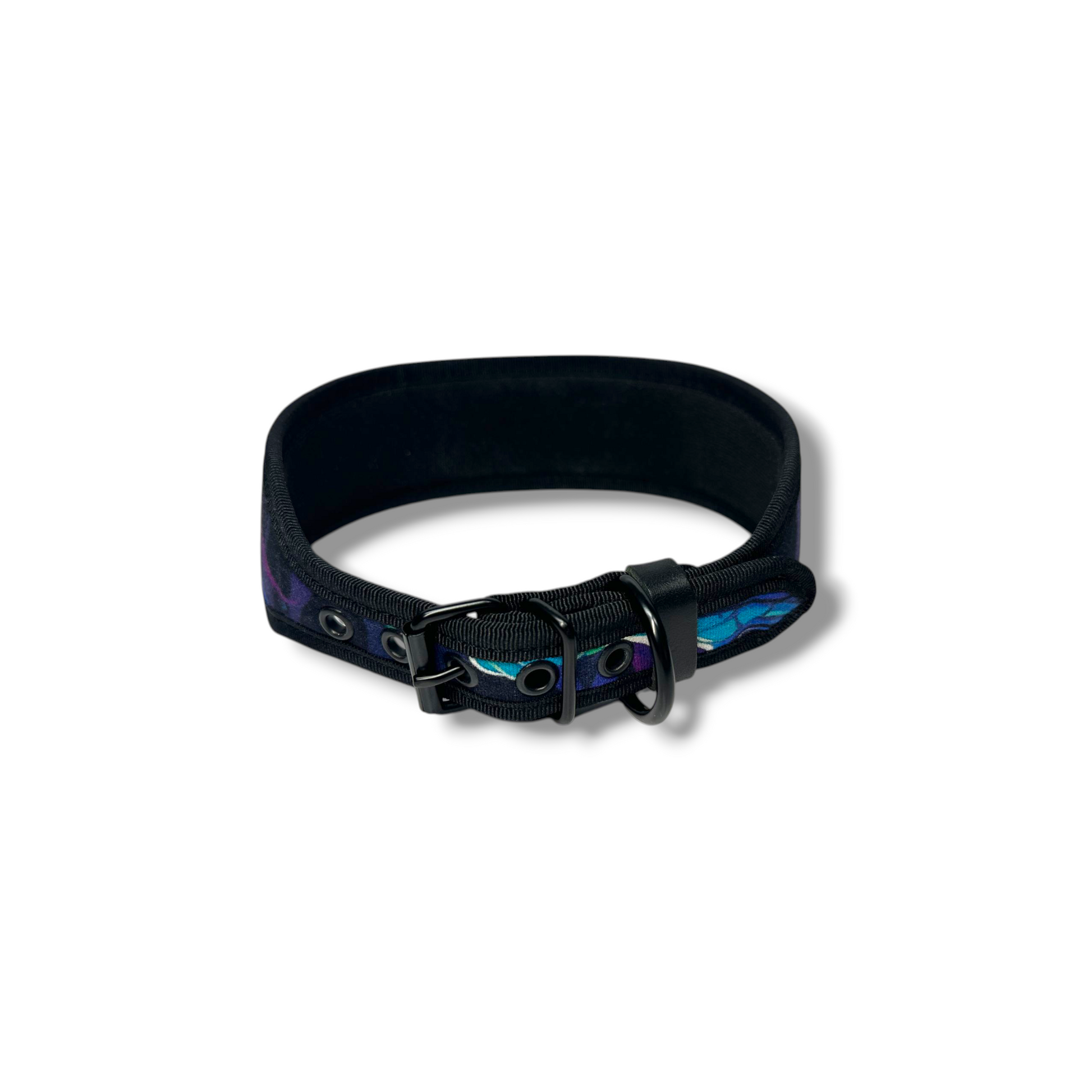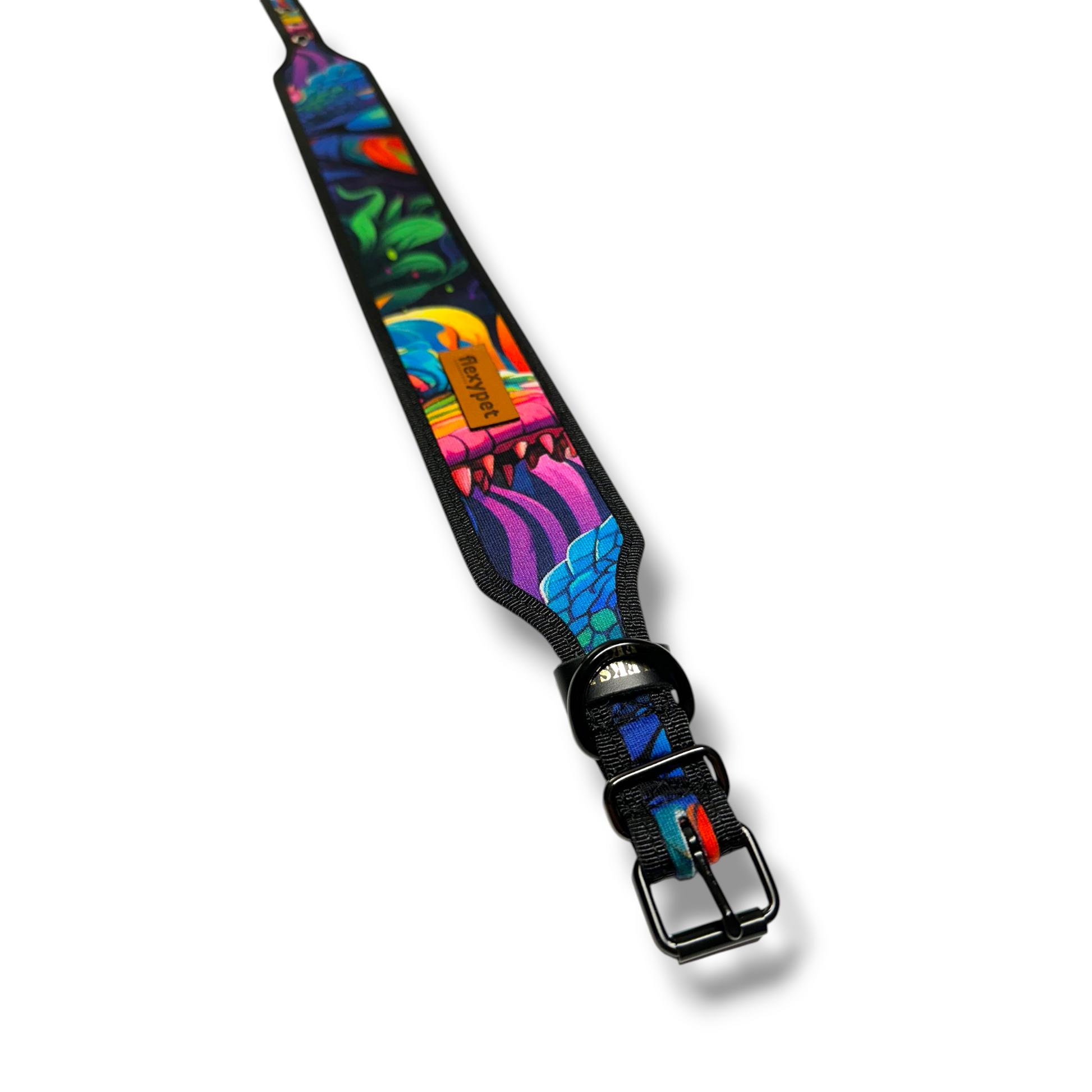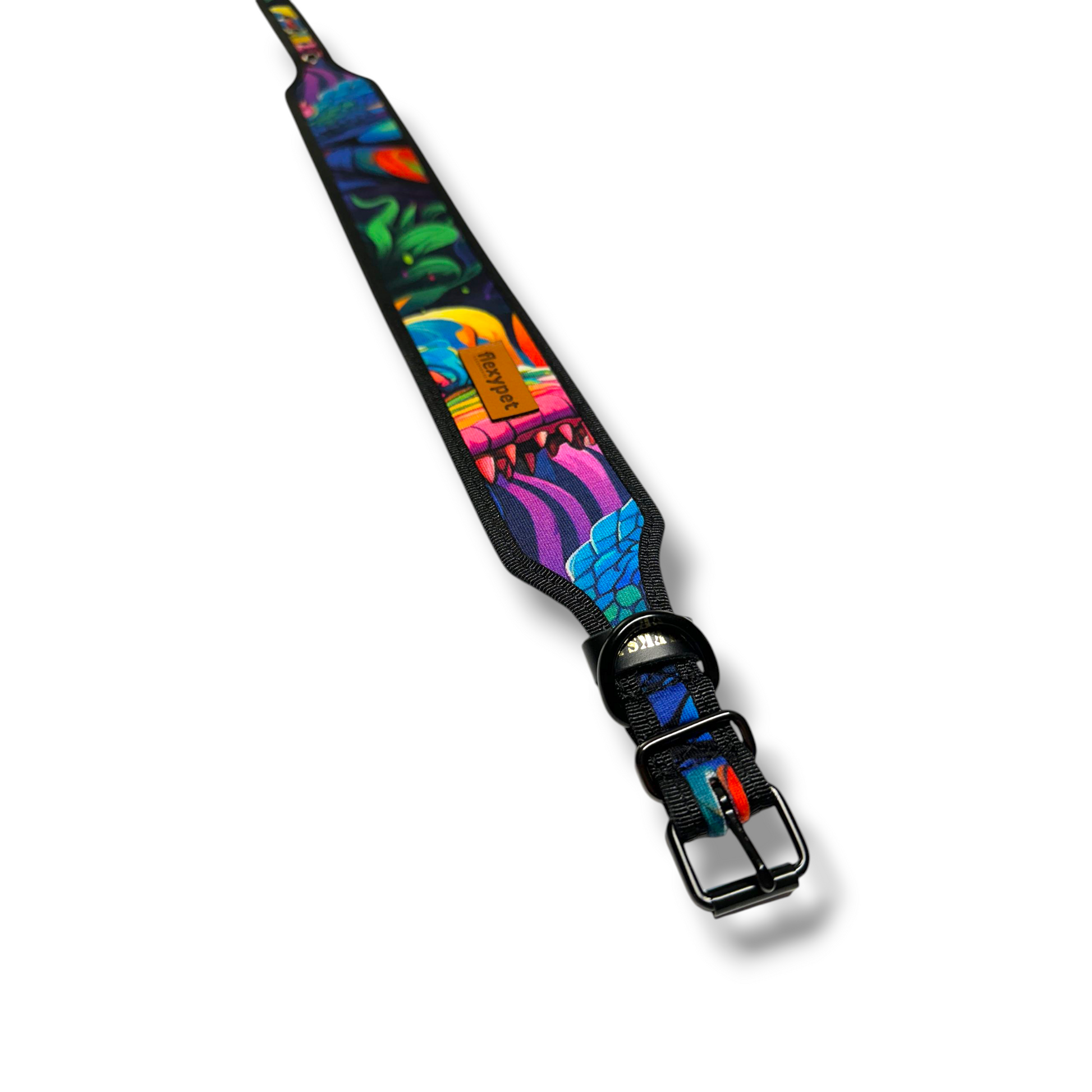Manufactured by Flekso with a focus on pet safety and comfort. Our fabric collar ensures control and safety for your dog while prioritizing durability and quality materials. Made of polyester, neoprene, metal, and elastane.
