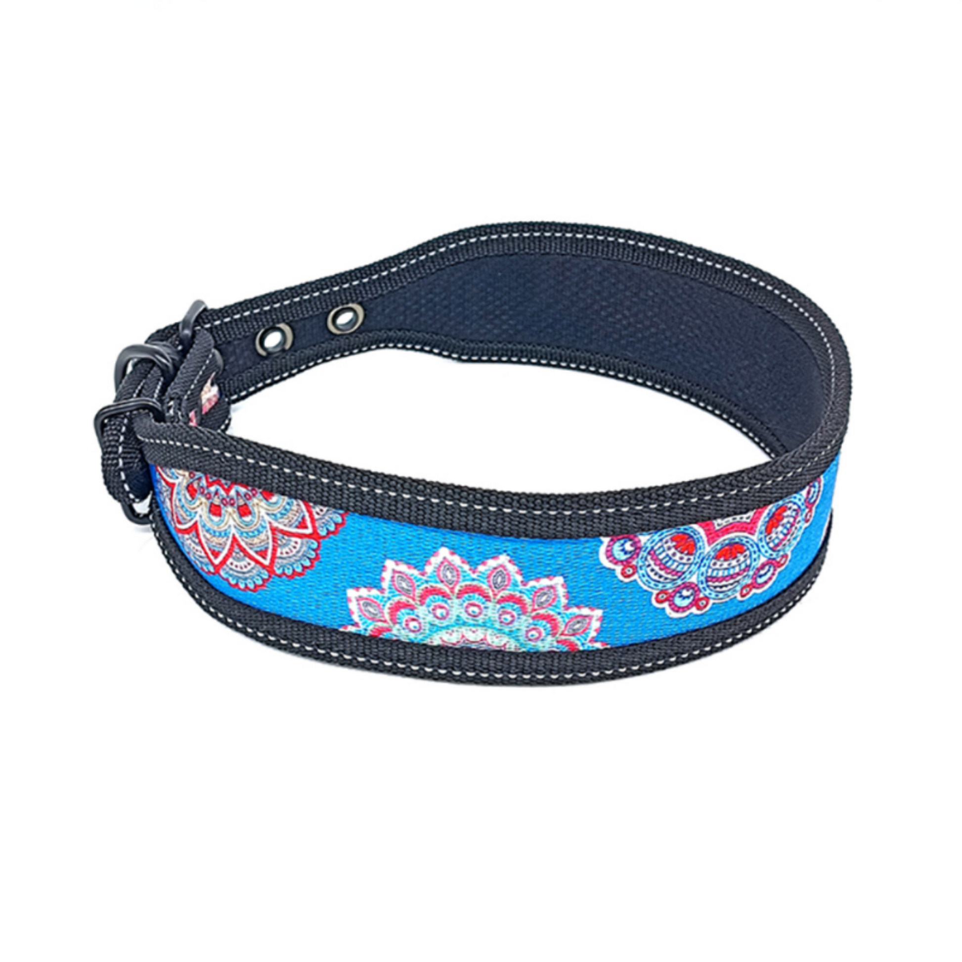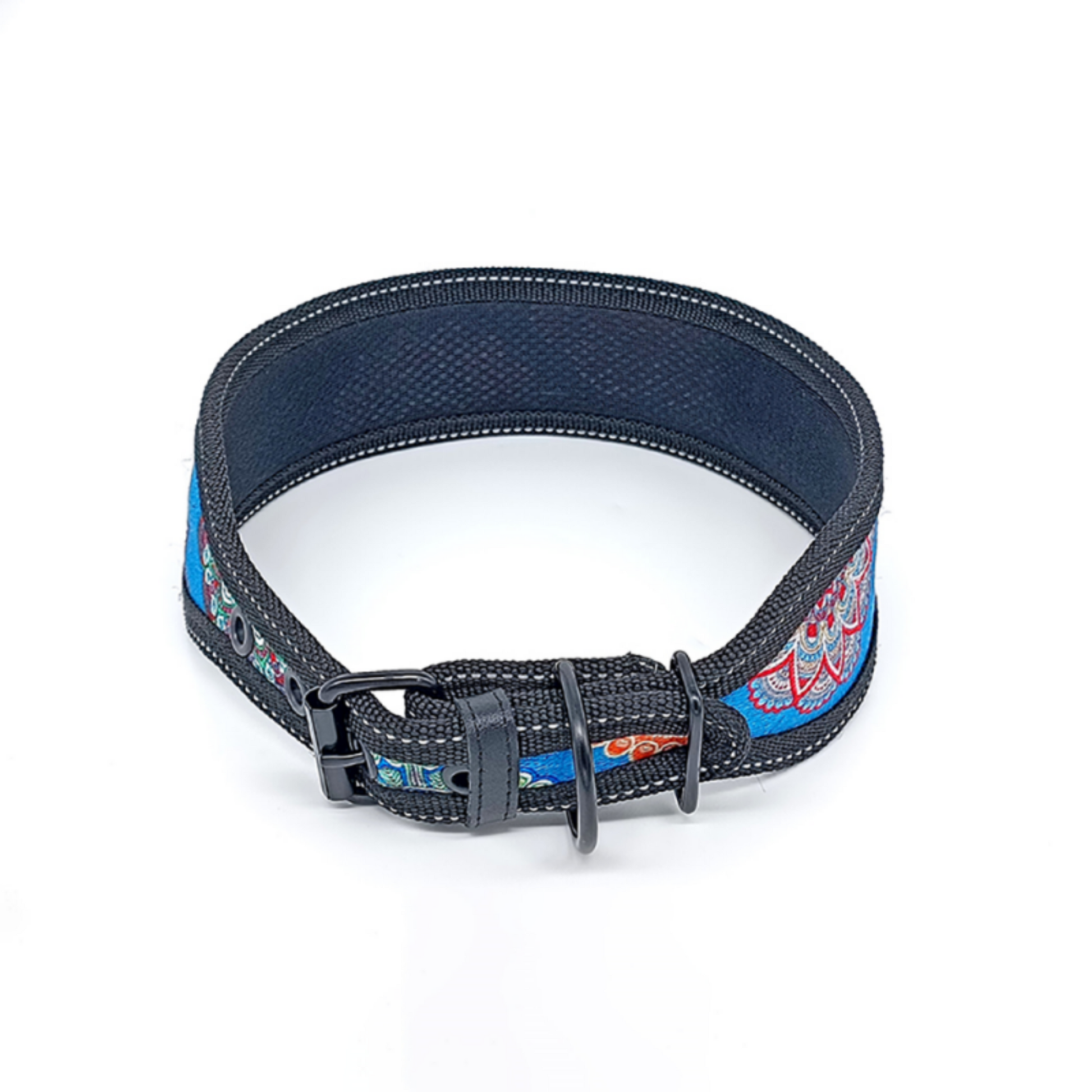 Crafted for larger dog breeds, this fabric collar boasts colorful strips externally and reflective stitching for added visibility. Its breathable inner padding ensures comfort, while the metal buckle offers durability. Ideal for daily wear, providing both security and style.